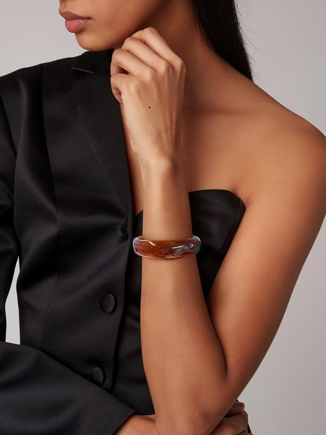 The bangle is made of acrylic resin and acetate-style material, which is a lightweight, durable plastic that mimics the look of natural materials like tortoiseshell. That material choice makes it affordable while still giving you a glossy, high-impact finish.