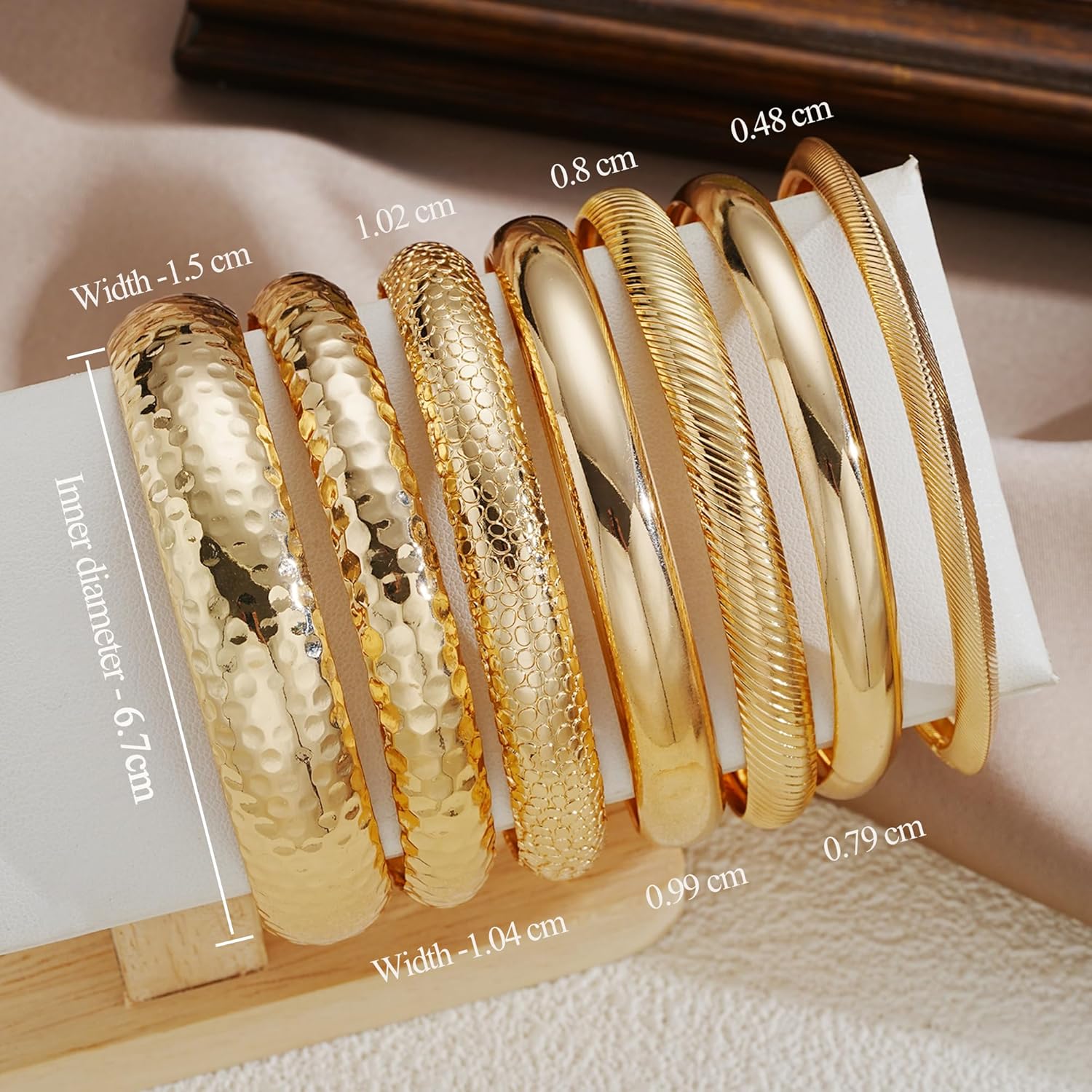 The bangles vary in diameter slightly to encourage a layered look; slimmer bangles slide nearer your wrist while chunkier ones sit a bit looser. You’ll want to try different combinations to find a stack that feels secure without being restrictive.